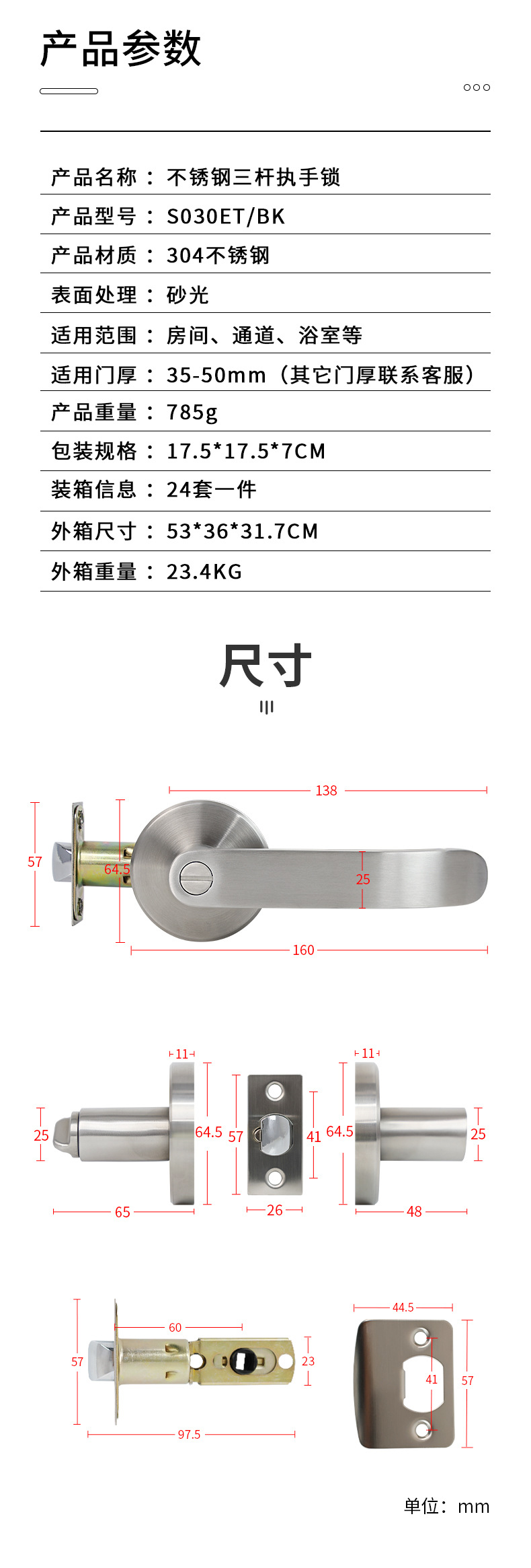 S030 带钥匙/不带钥匙欧式三杆执手锁